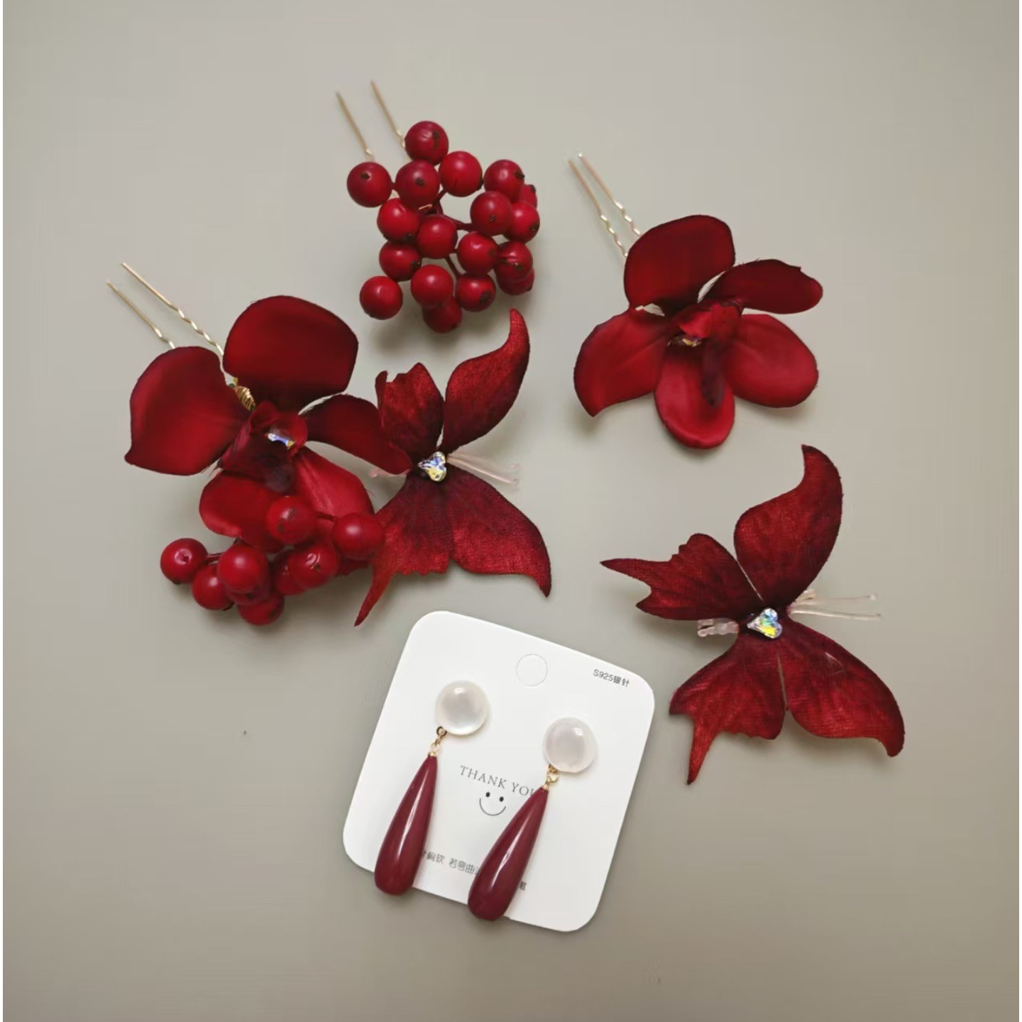 复古红色山茶花低丸子头古风旗袍发饰清汉女蝴蝶发夹侧边新娘头饰