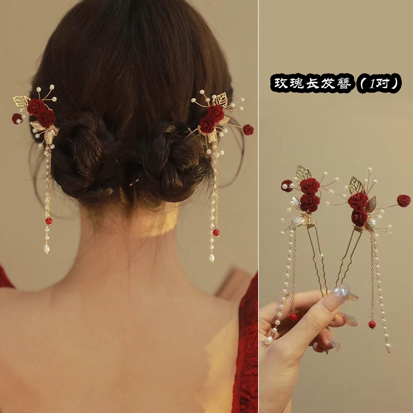 新中式新娘头饰红色玫瑰花发簪u型簪子女古风发饰高级感珍珠发卡