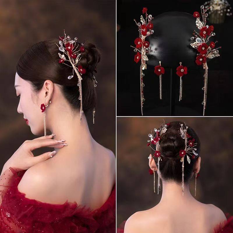 新款中式新娘头饰红色花朵流苏发夹结婚敬酒服旗袍配饰发饰高级感