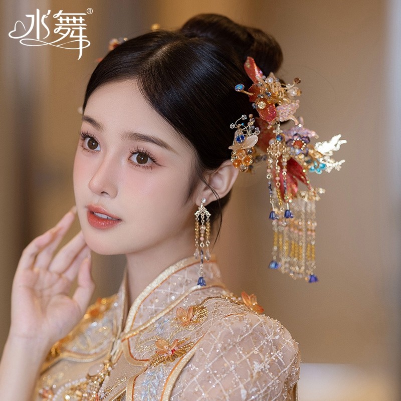 新中式新娘头饰红色秀禾服旗袍汉服头饰发夹套装古风发饰流苏对夹