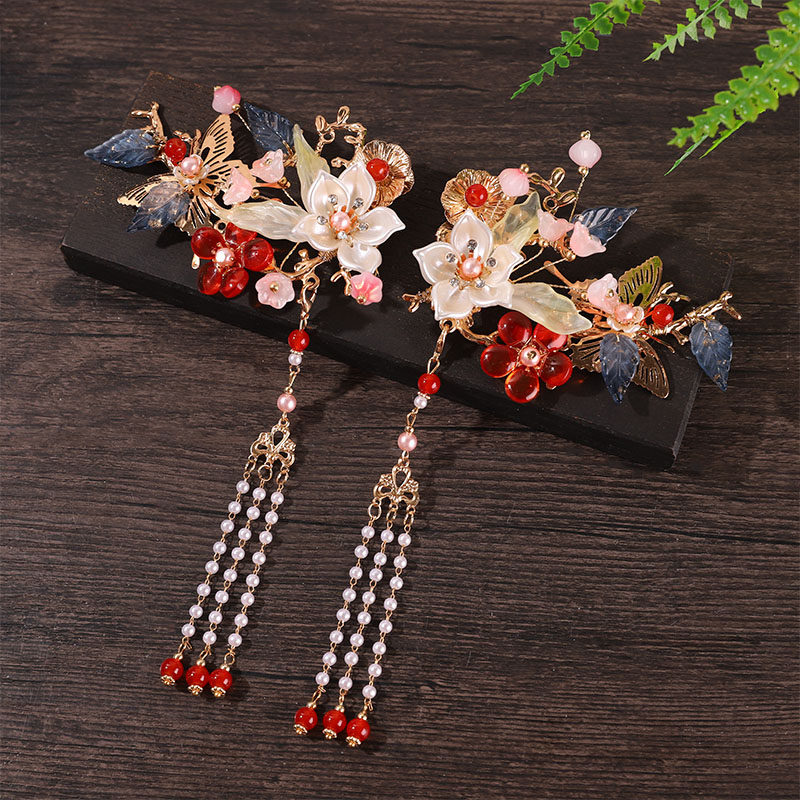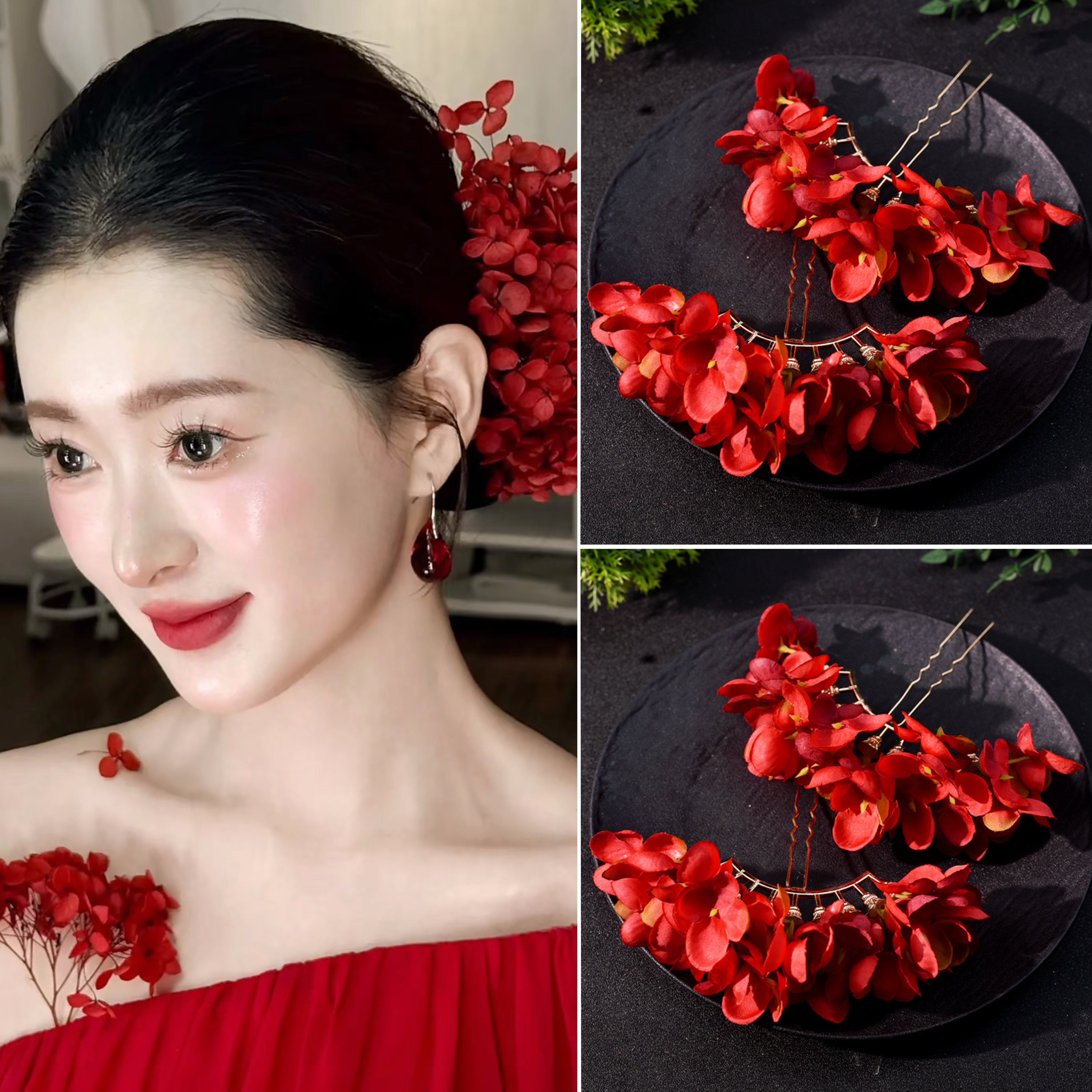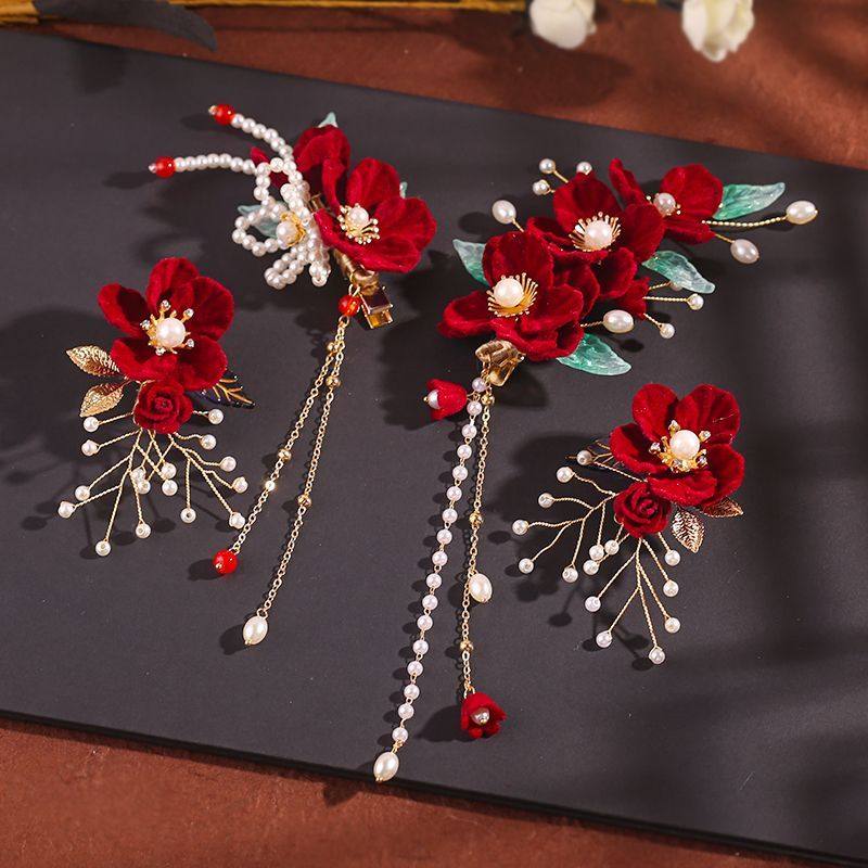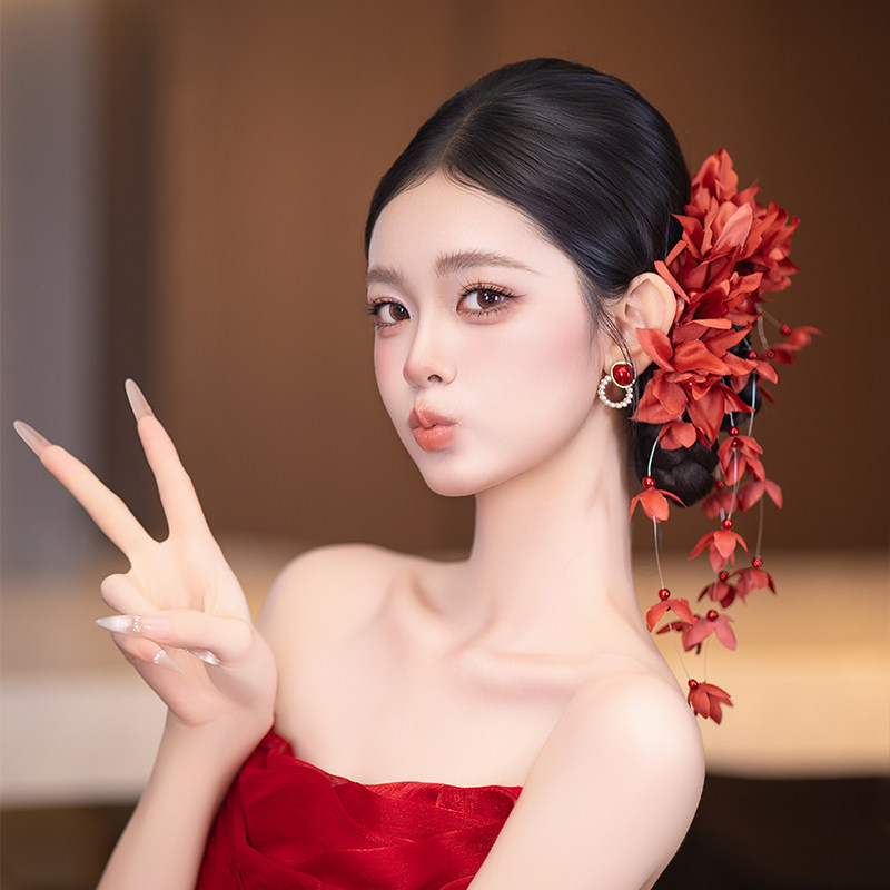 新中式新娘头饰红色花瓣流苏发夹国风复古气质高级感结婚礼服配饰