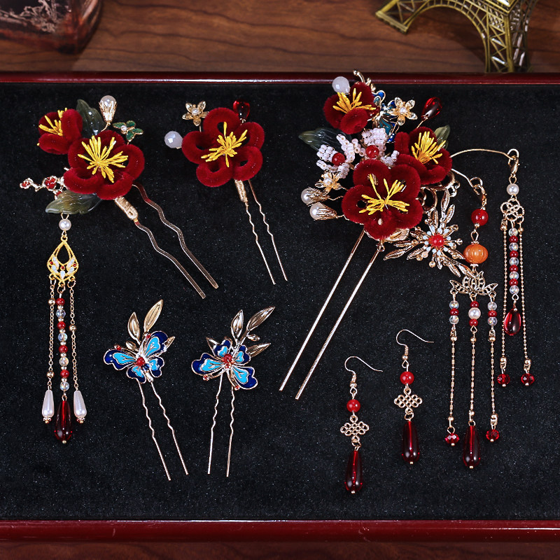 新中式新娘头饰红色绒布发簪套装2025年新款高级感马面裙旗袍发饰