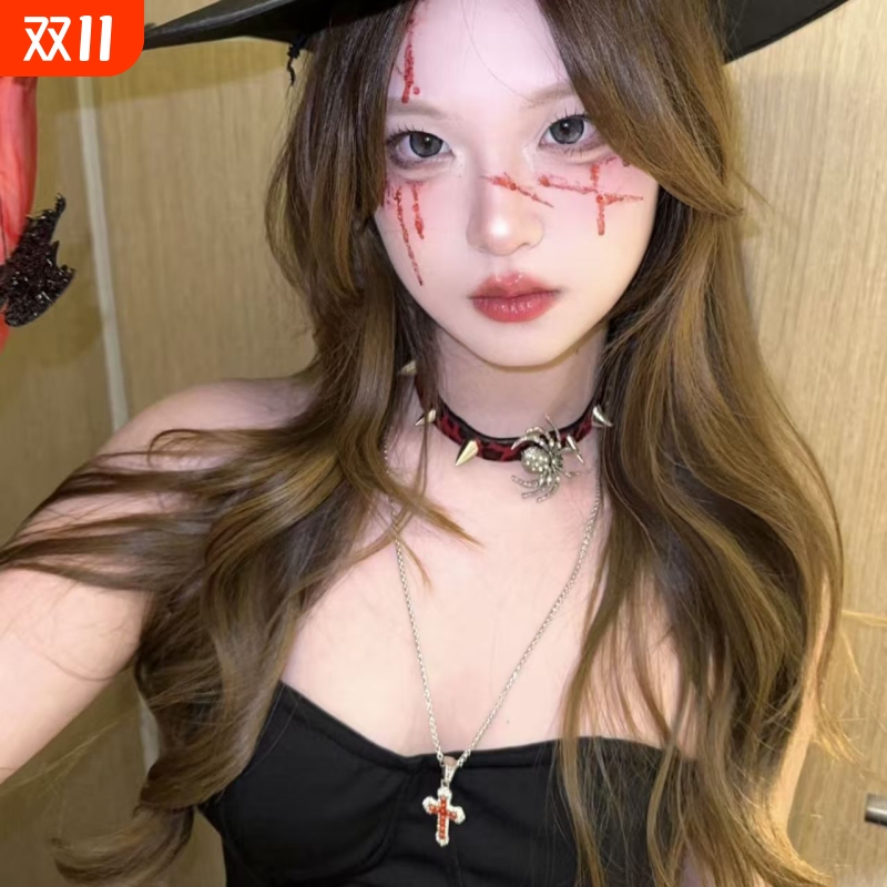 万圣节复古豹纹锁骨项链哥特蕾丝choker气质黑色颈链吊坠礼服配饰