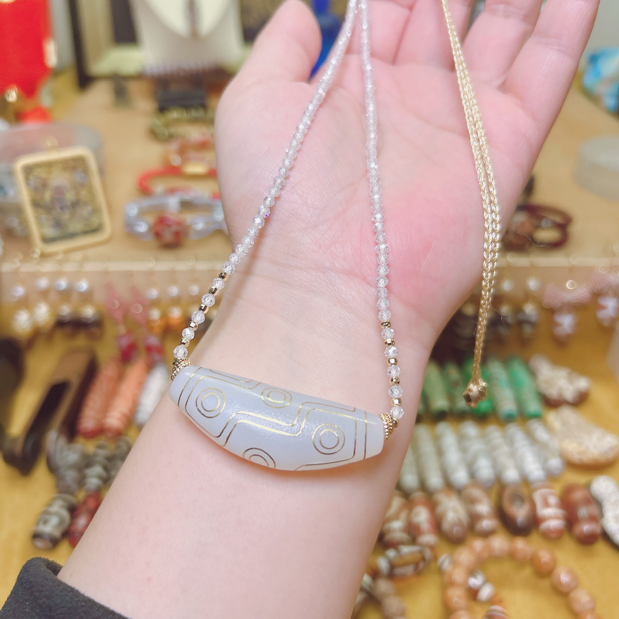精品错金工艺牛角九眼天珠之王精编白色锆石可伸缩调节锁骨项链绳