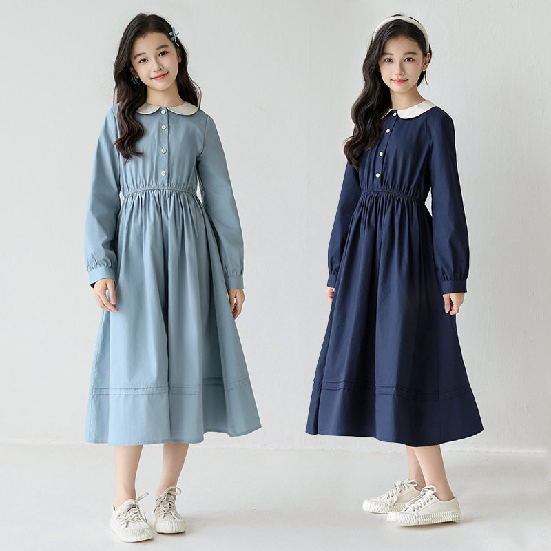 春秋季中大女童翻领衬衫裙文艺清新连衣裙长袖纯棉宽松学生中长裙