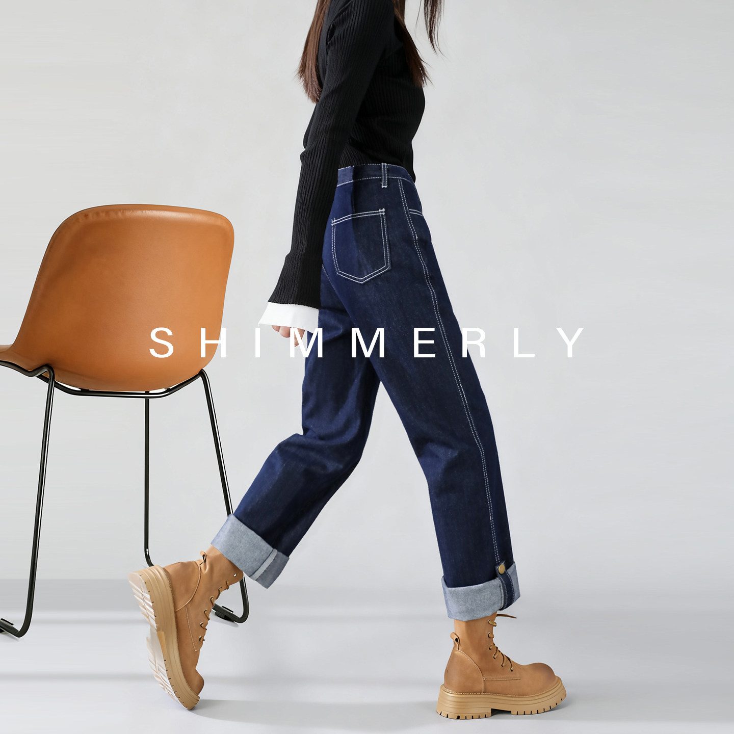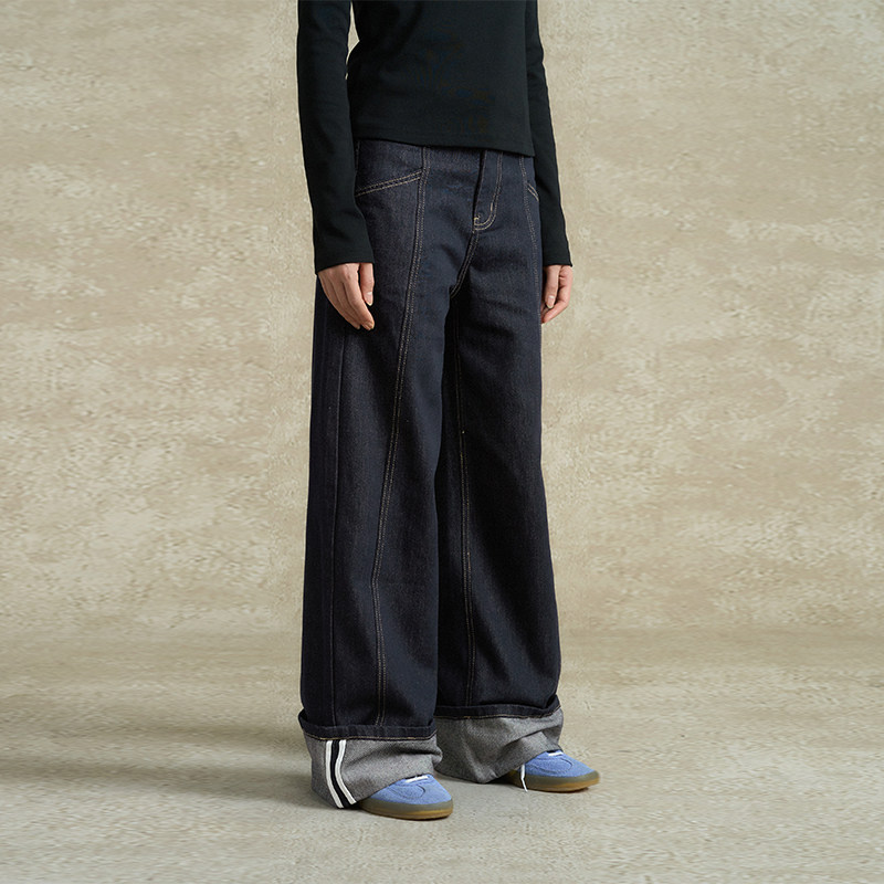 SIXI四喜家 纽约街区 分割立体裁剪直筒阔腿牛仔裤女冬卷边休闲裤