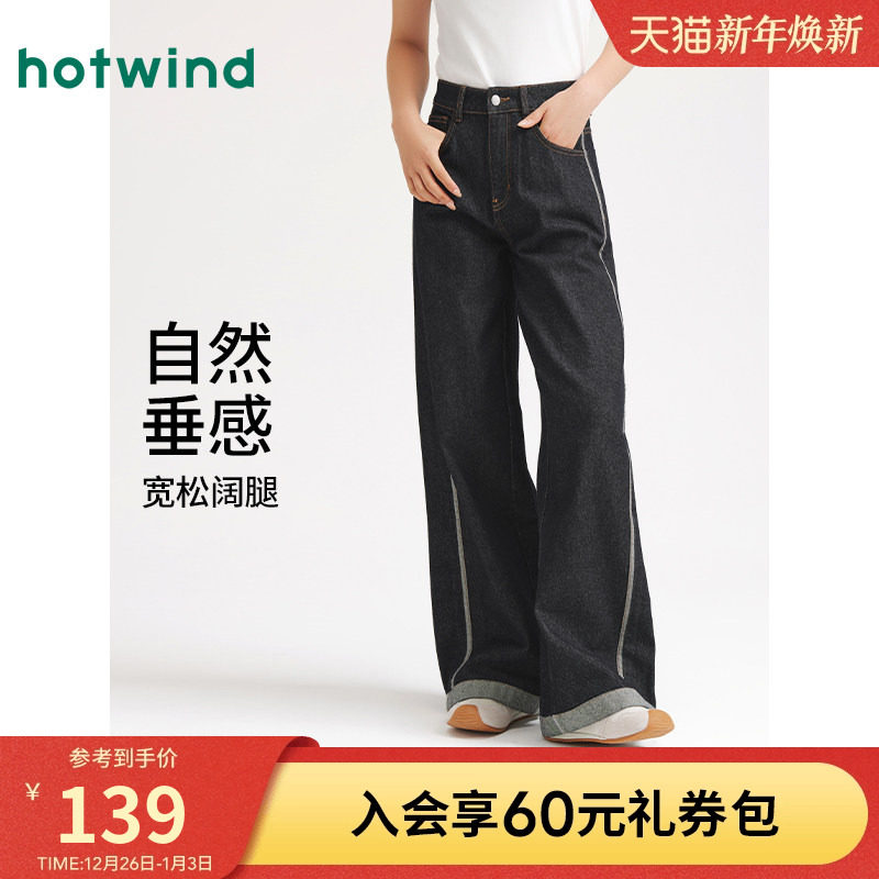 热风女士直筒牛仔裤2025年秋季新款阔腿牛仔裤宽松卷边牛仔长裤