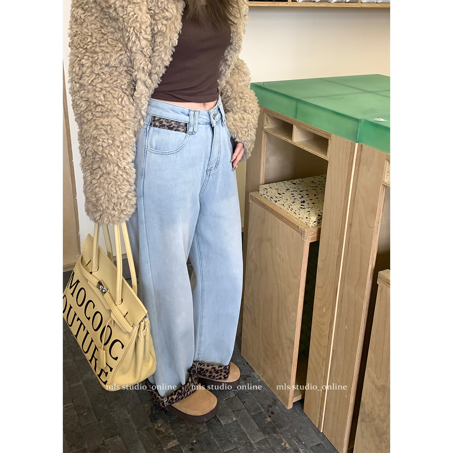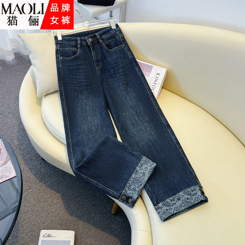 MLS 牛仔裤女春季2025高腰直筒裤宽松加绒豹纹卷边牛仔裤阔腿裤
