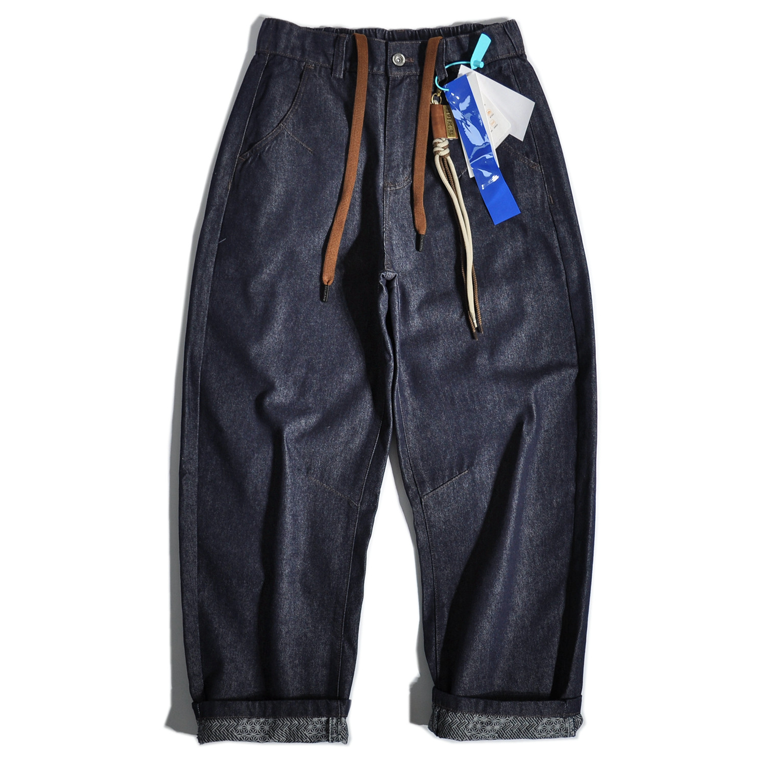 Vintage日系复古卷边弯刀直筒牛仔裤水洗宽松阔腿美式休闲长裤男