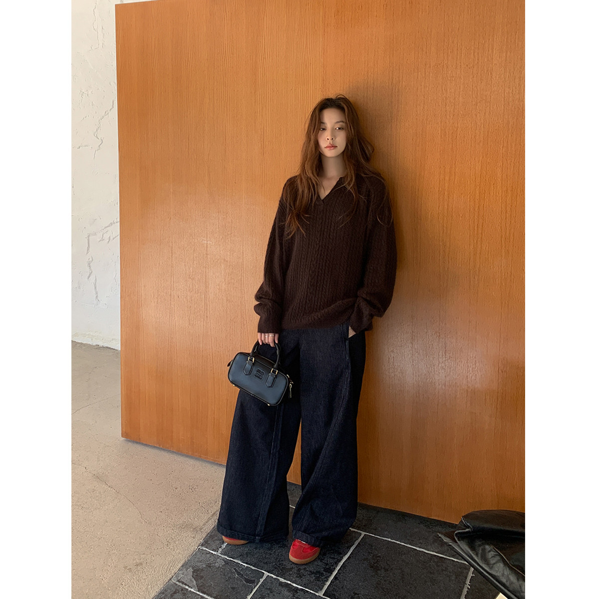 BANANA CICI2025年冬季新款复古拼接麂皮撞色中腰阔腿卷边牛仔裤