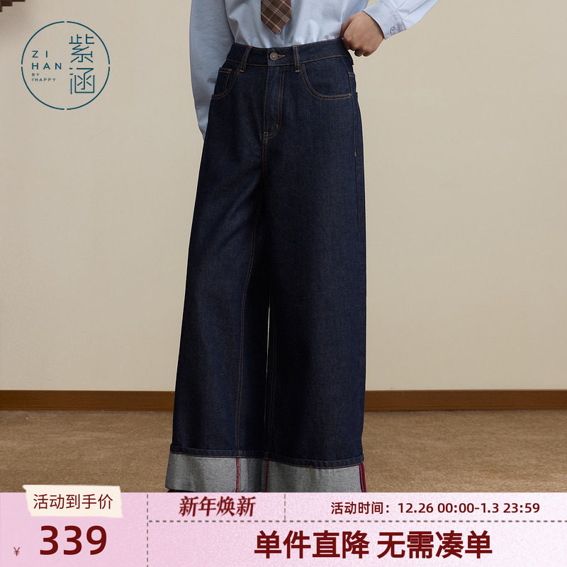 紫涵撞色卷边阔腿牛仔裤女2025年秋季新款高腰宽松显瘦深蓝休闲裤