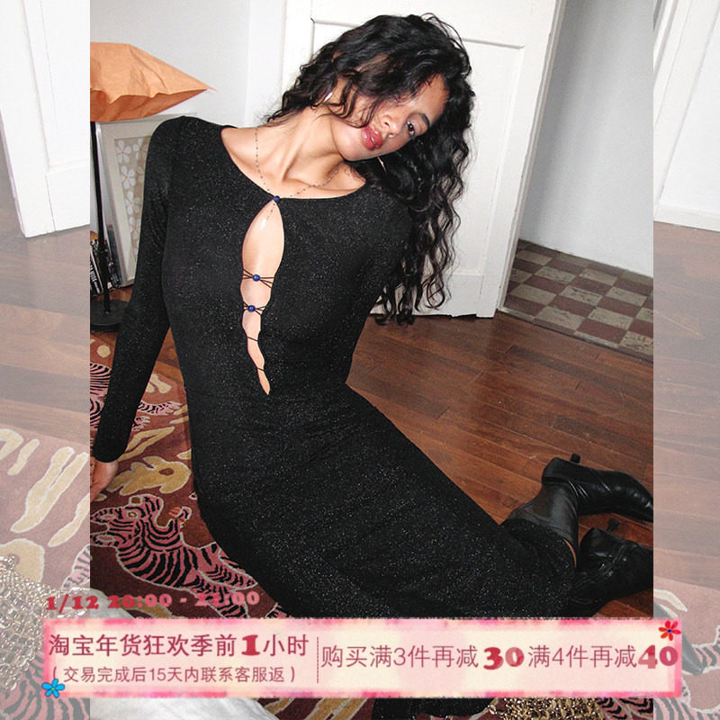 黑色半高领镂空长袖连衣裙女秋冬季露背性感辣妹内搭收腰包臀短裙