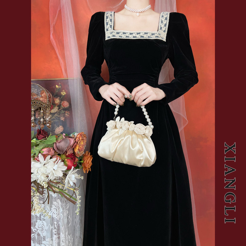 巷里法式复古黑色连衣裙秋冬宫廷赫本拼接显瘦气质女神礼服丝绒裙