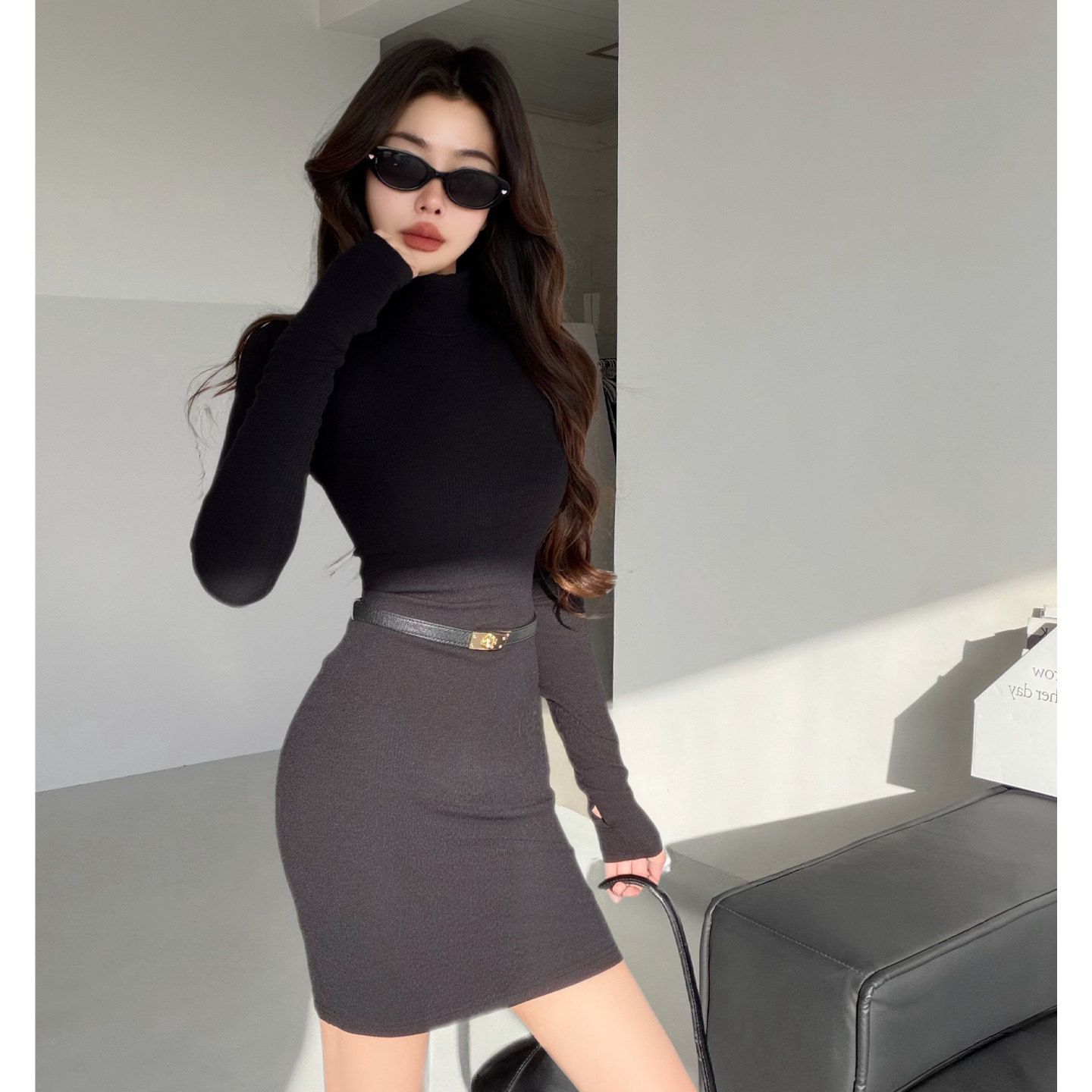 高智风~自留百搭黑色连衣裙秋冬高领加厚显身材内搭打底包臀裙子
