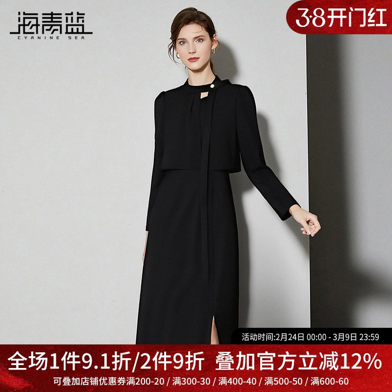 海青蓝 黑色连衣裙秋冬女2025年新款高级设计感女装开叉长袖裙子