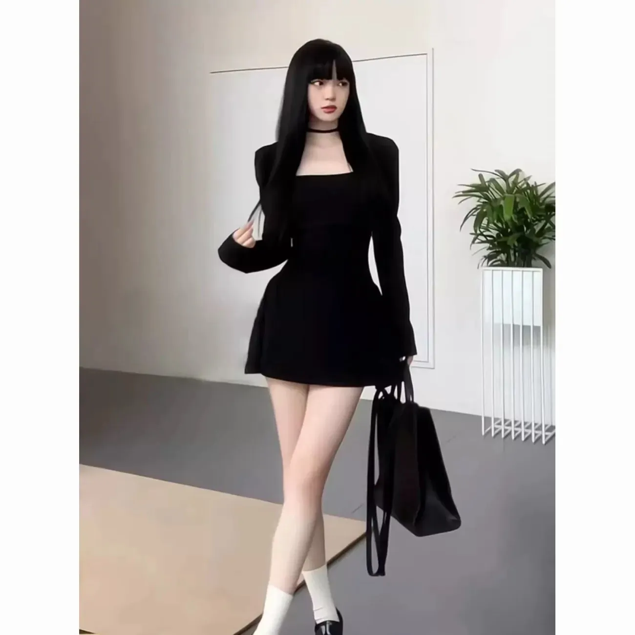 赫本风黑色连衣裙秋冬新款法式小个子收腰显瘦纯欲长袖方领小黑裙