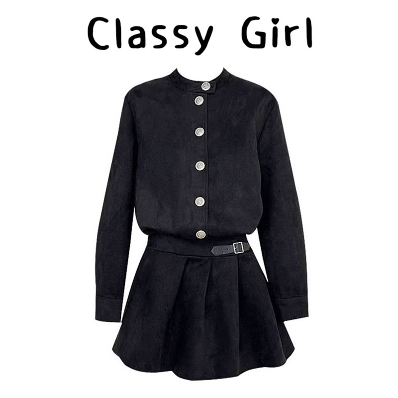Classy girl 麂皮绒黑色连衣裙秋冬季穿搭千金感巨好看收腰短裙