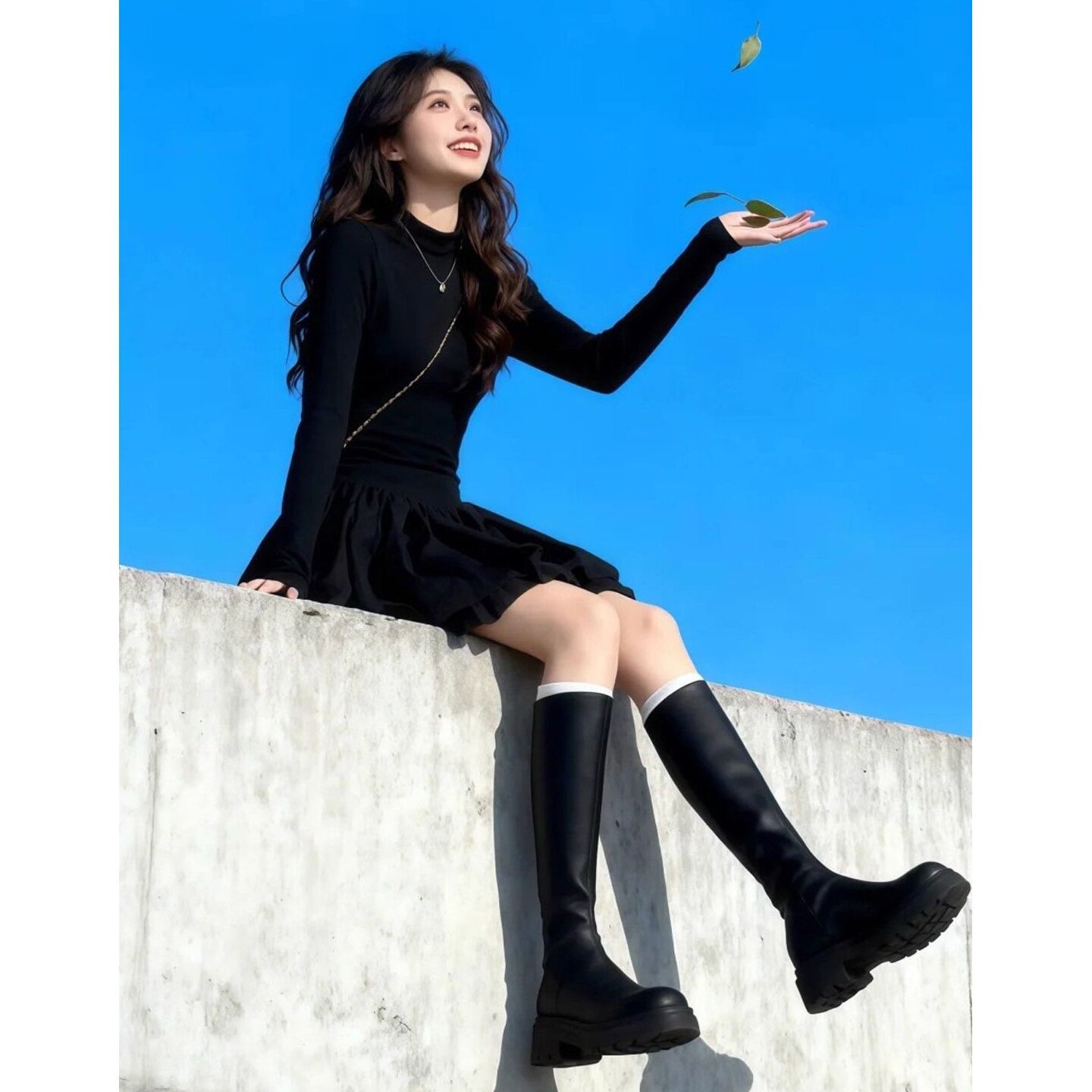 ins风法式气质名媛氛围感黑色连衣裙秋冬大衣内搭半高领蓬蓬裙子