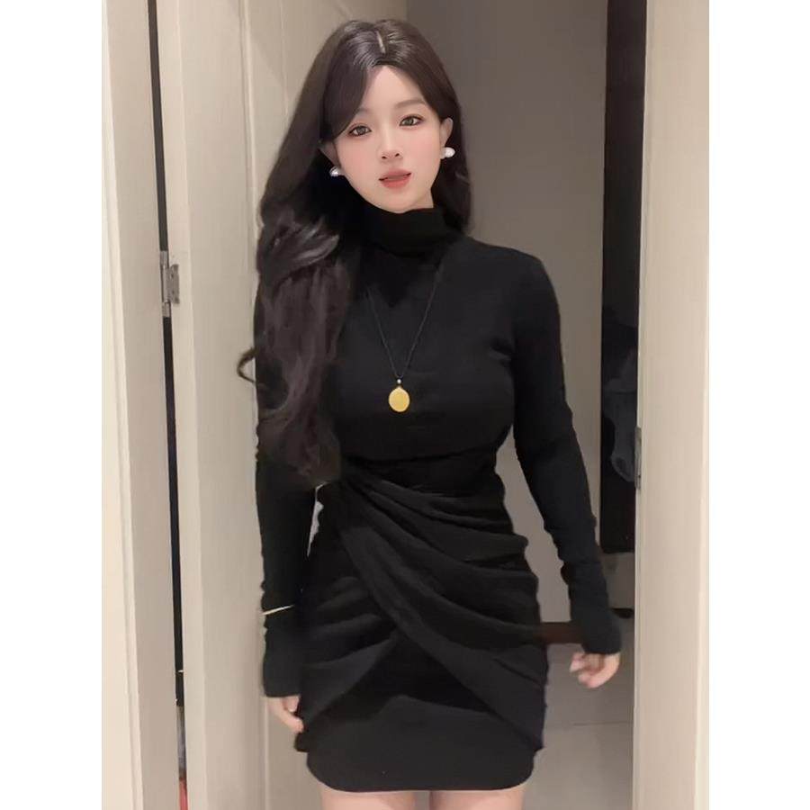 纯欲辣妹半高领长袖黑色连衣裙秋冬新款修身紧身显瘦打底裙子短裙