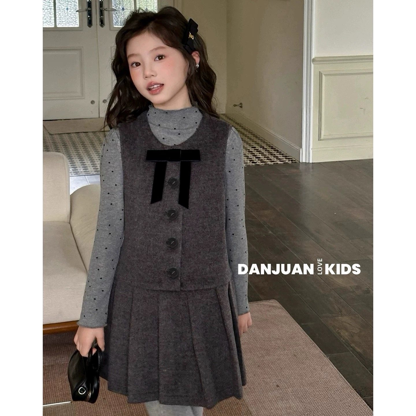 秋冬新款设计感木耳边打底上衣+蝴蝶结背心裙子女学生韩版两件套