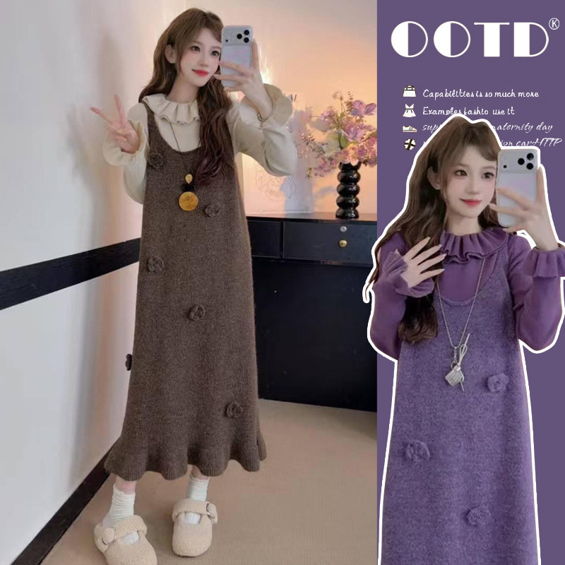 2025秋冬孕妇装韩版宽松大码毛呢蝴蝶结背心裙搭配打底毛衣两件套