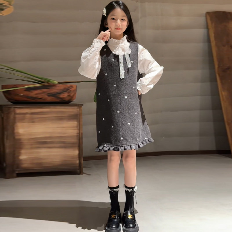 女童套装秋冬2026新款中大童爱心毛呢裙韩版衬衫背心裙两件套洋气