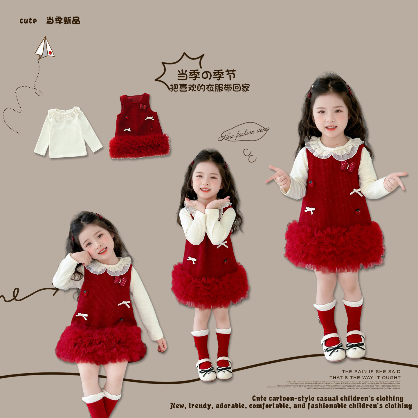 秋冬女童娃娃领打底衫蓬蓬背心套装裙加厚宝宝红色礼服网纱公主裙