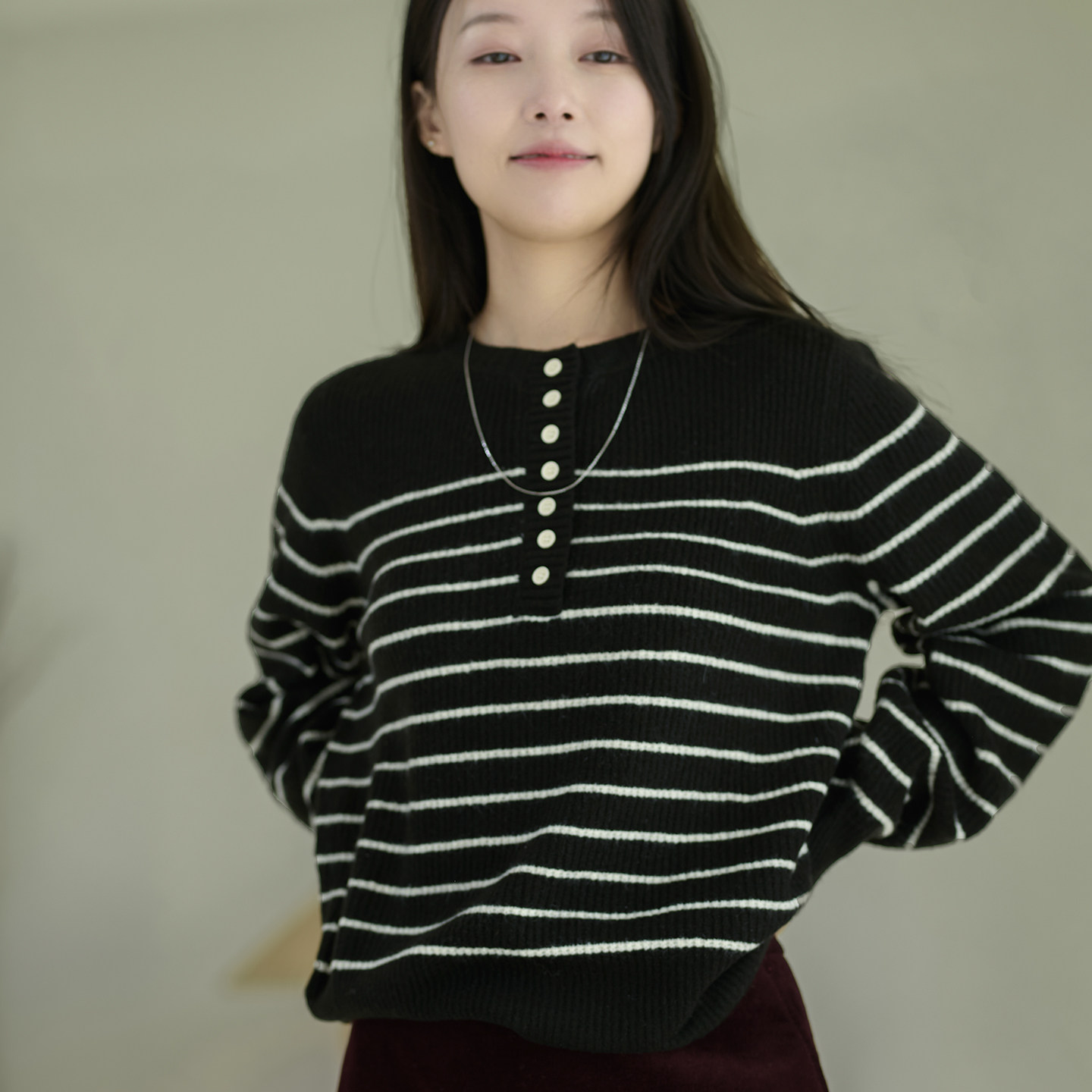 26CXM-005【山黛】前世今生复古温暖文艺圆领半开门襟横条纹毛衣