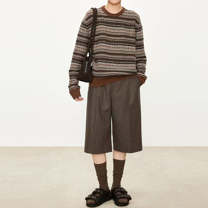 LUUD 撞色横条纹提花圆领针织衫男士高克重730G复古简约保暖毛衣