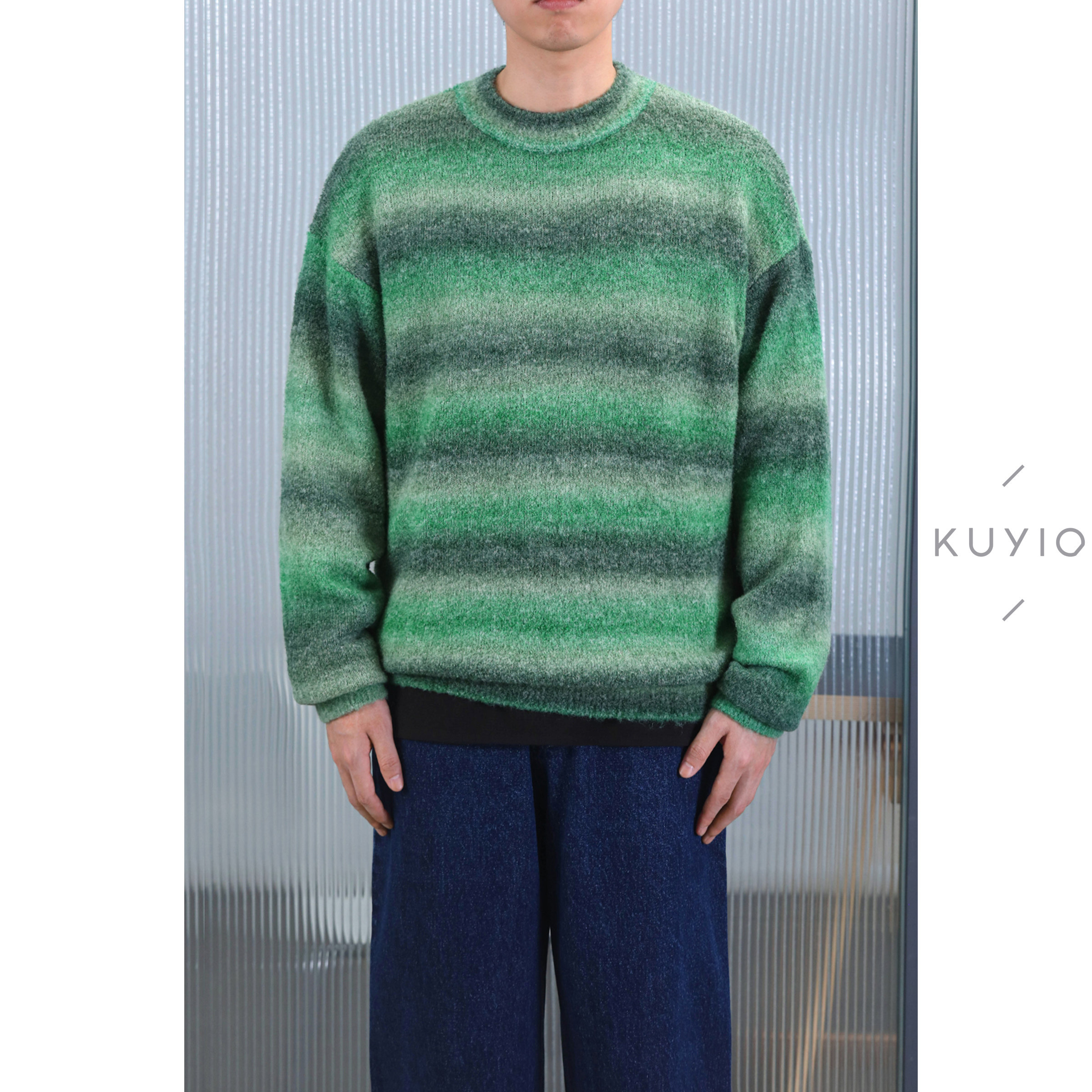 KUYIOU/段染渐变圈圈纱 羊毛混纺横条纹宽松落肩圆领套头毛衣男