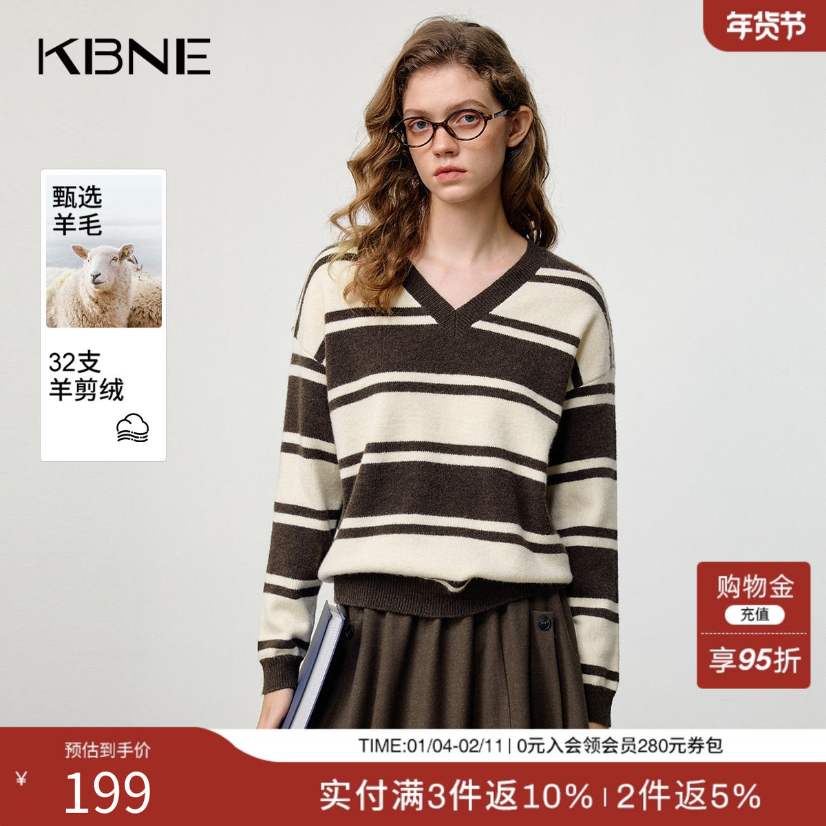 KBNE32支羊剪绒v领针织衫女2025冬季新款横条纹套头长袖毛衣上衣