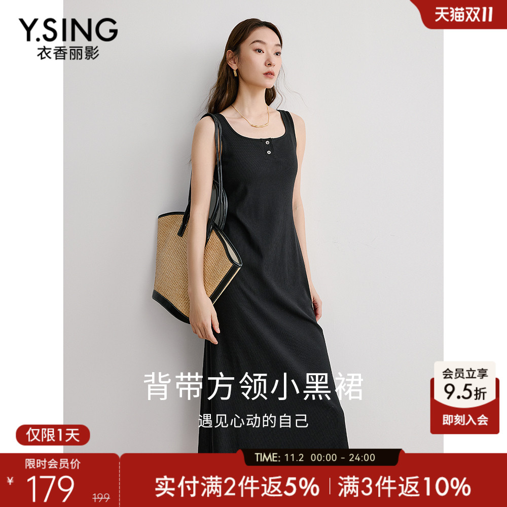 衣香丽影黑色背带连衣裙女2025秋冬装新款流行方领吊带裙小黑裙子