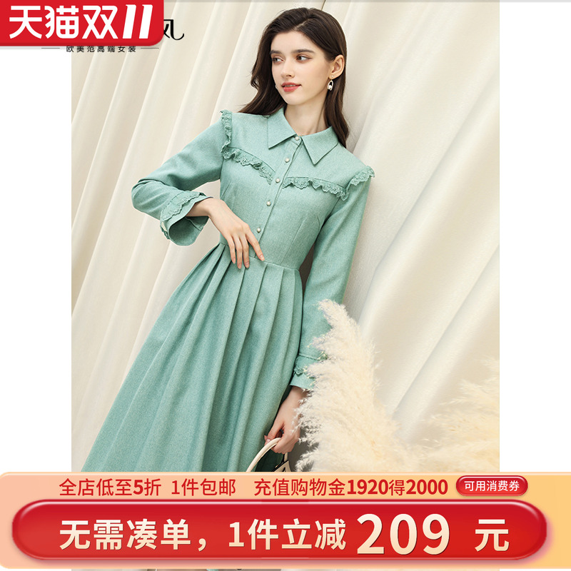 紫涵衬衫领中长款连衣裙女秋冬新款文艺复古收腰宽松长袖A字裙子