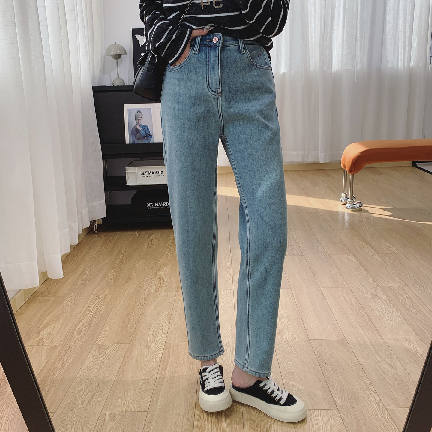- 加绒哈伦牛仔裤女冬