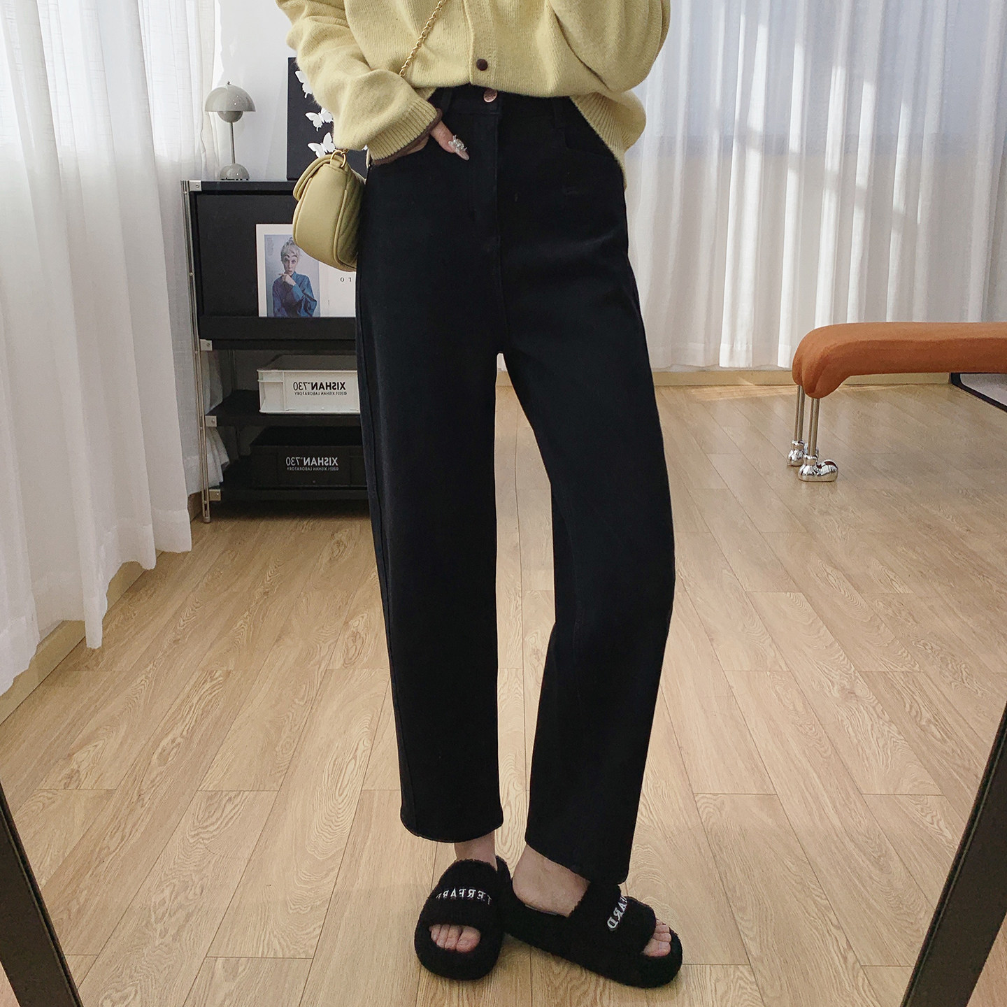 黑色牛仔裤女九分弹力秋冬薄绒厚绒高腰显瘦宽松哈伦裤小脚萝卜裤