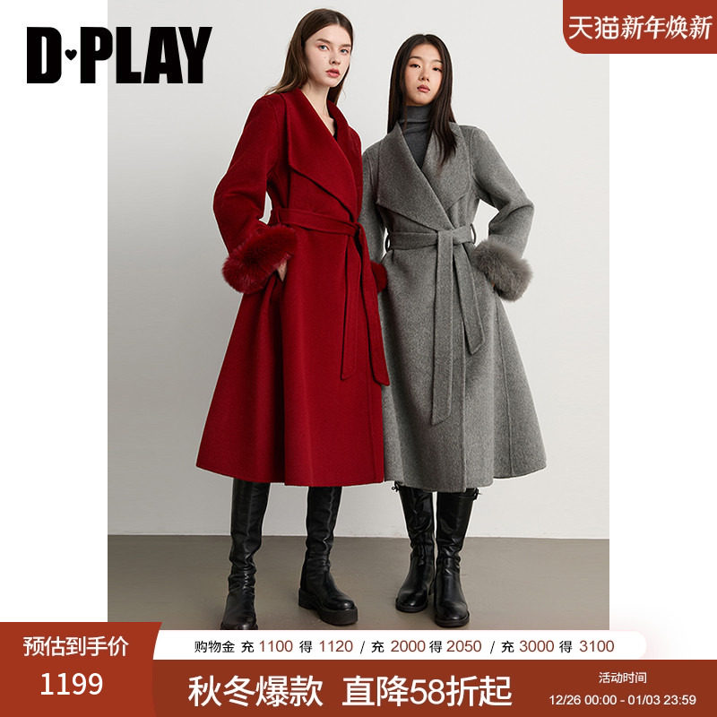 DPLAY2025年冬季新款灰色双面呢子大衣女收腰100绵羊毛外套