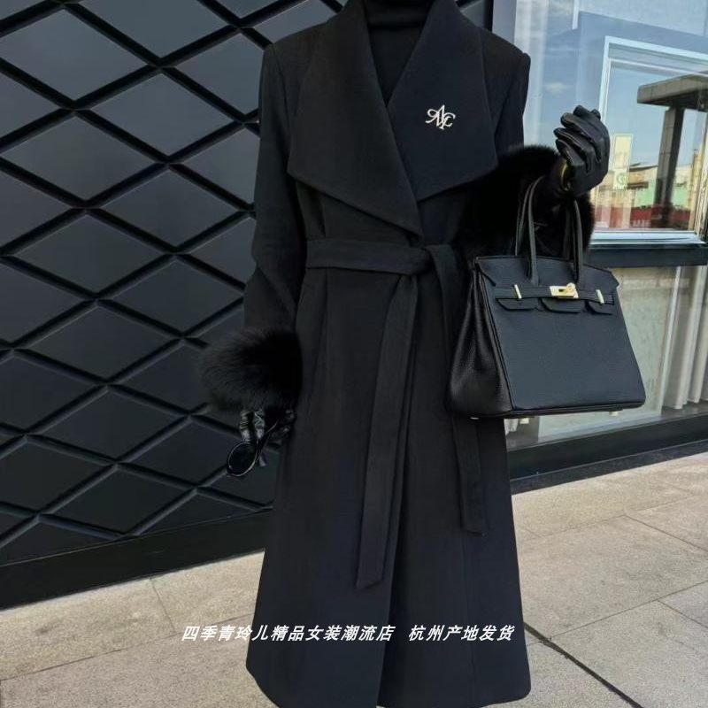 - 黑色长款毛呢大衣女厚