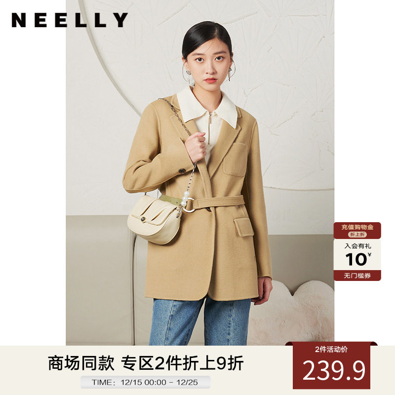 NEELLY纳俪商场同款西装双面呢大衣女收腰系带毛呢外套含羊毛保暖