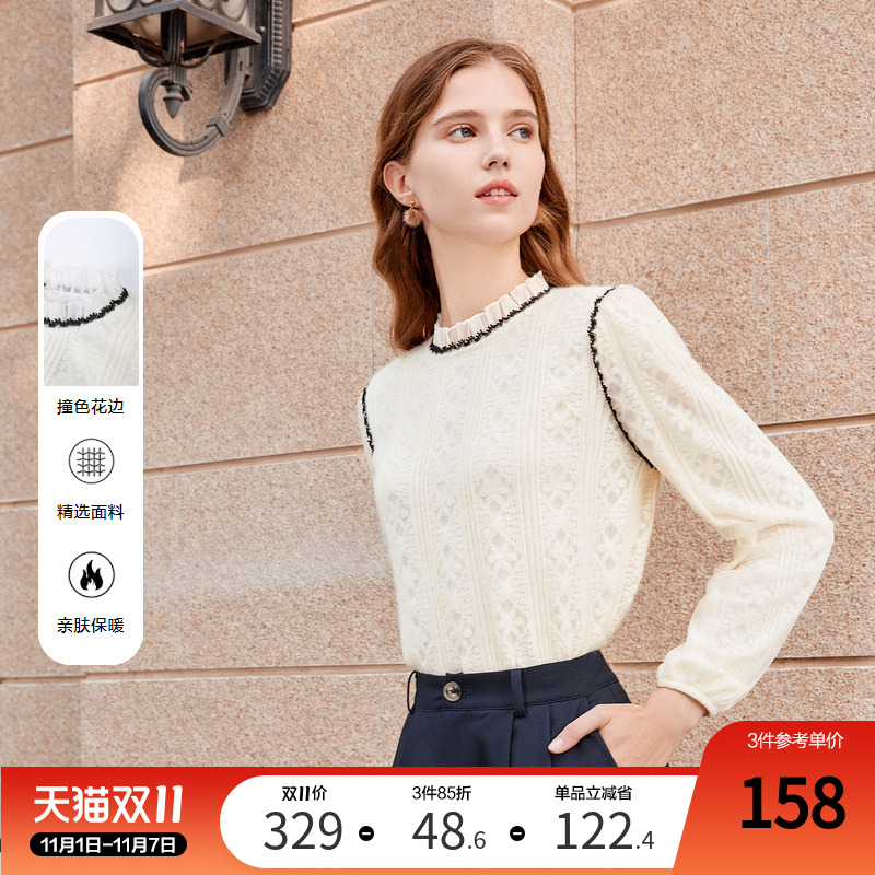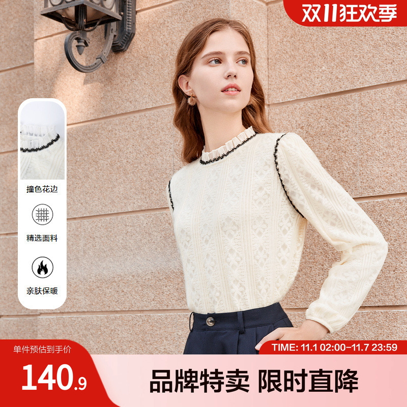 betu百图女装2024秋冬新款法式减龄蕾丝绣花荷叶边立领衬衫衬衣