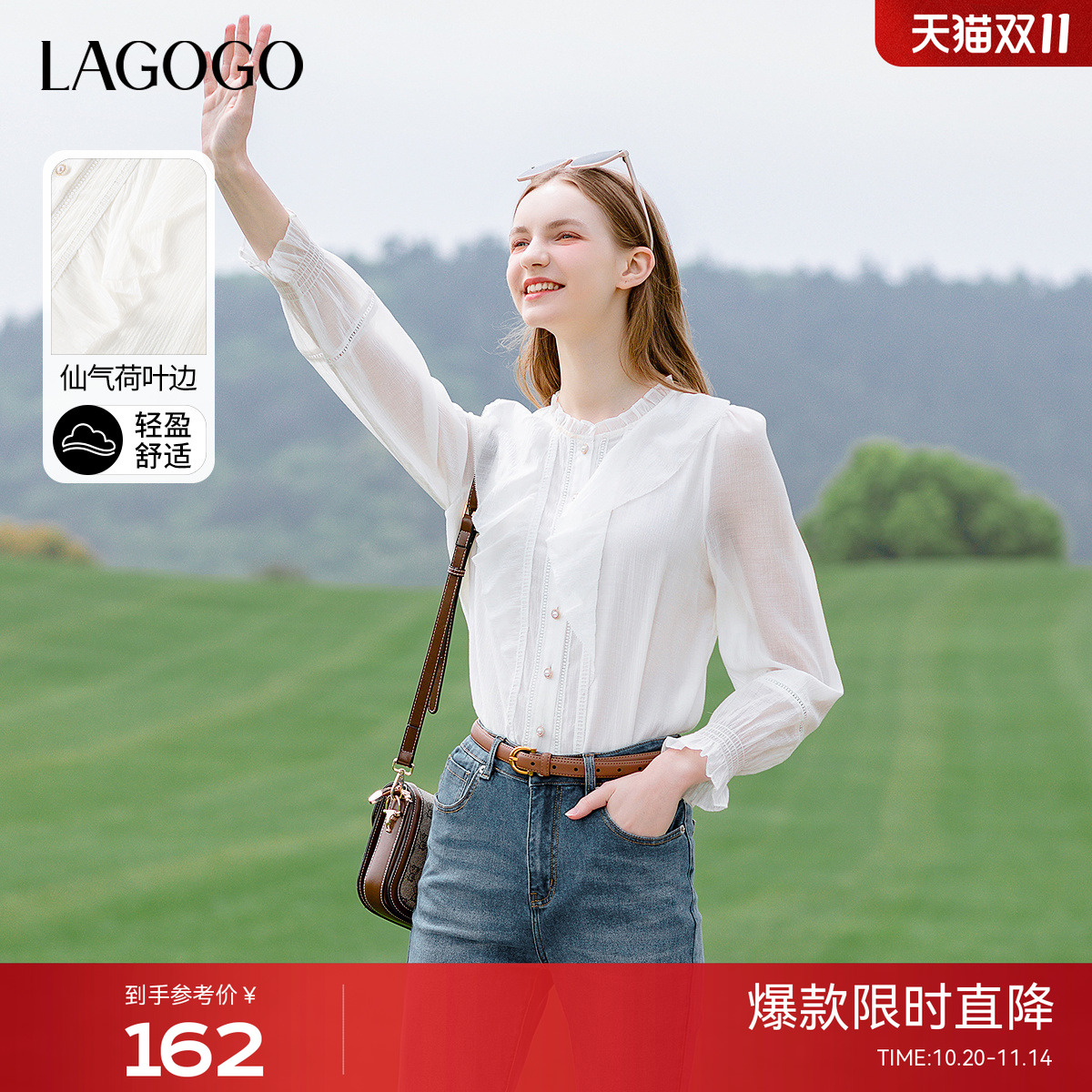 LAGOGO法式高级感荷叶边衬衫女拉谷谷春季新款花边立领百搭上衣