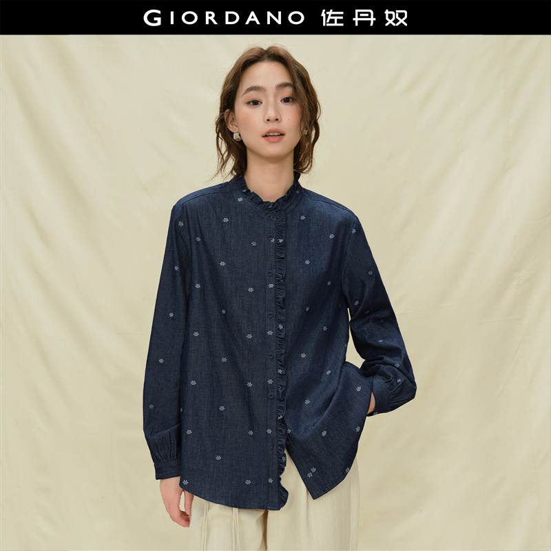 设计师款佐丹奴女装纯棉撞色提花荷叶边立领原牛牛仔衬衫18345228