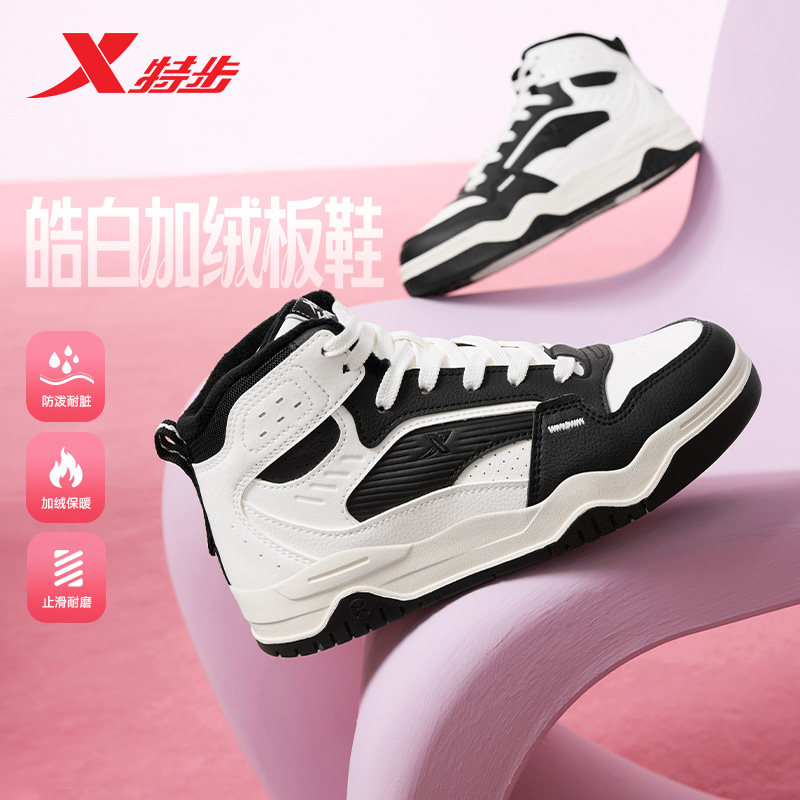 特步皓白板鞋女鞋秋冬皮面休闲鞋复古高帮加绒保暖棉鞋运动鞋男款