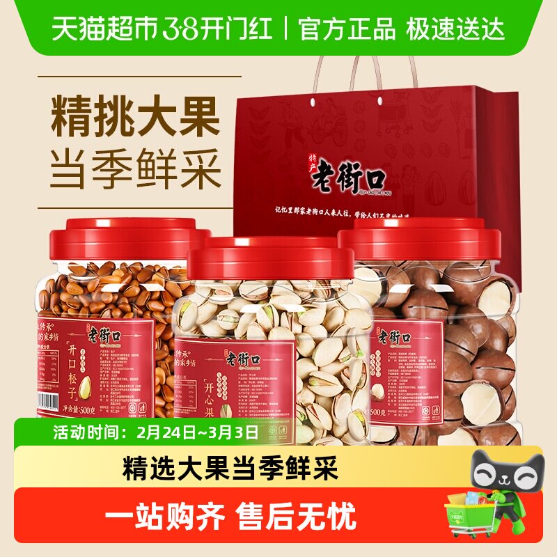 老街口3罐装坚果组合1500g大礼包大颗粒零食每日干果礼盒春节送礼