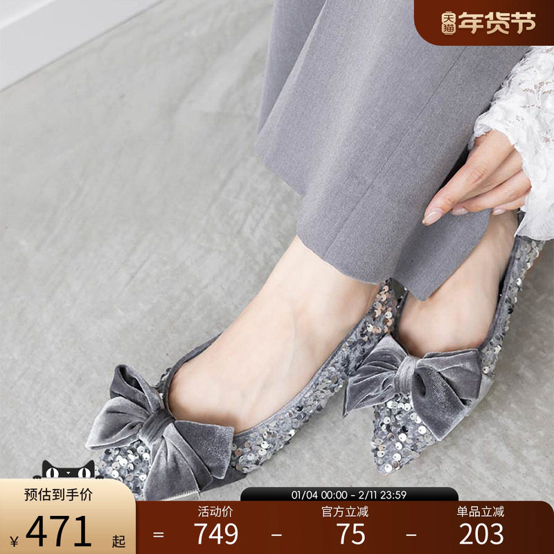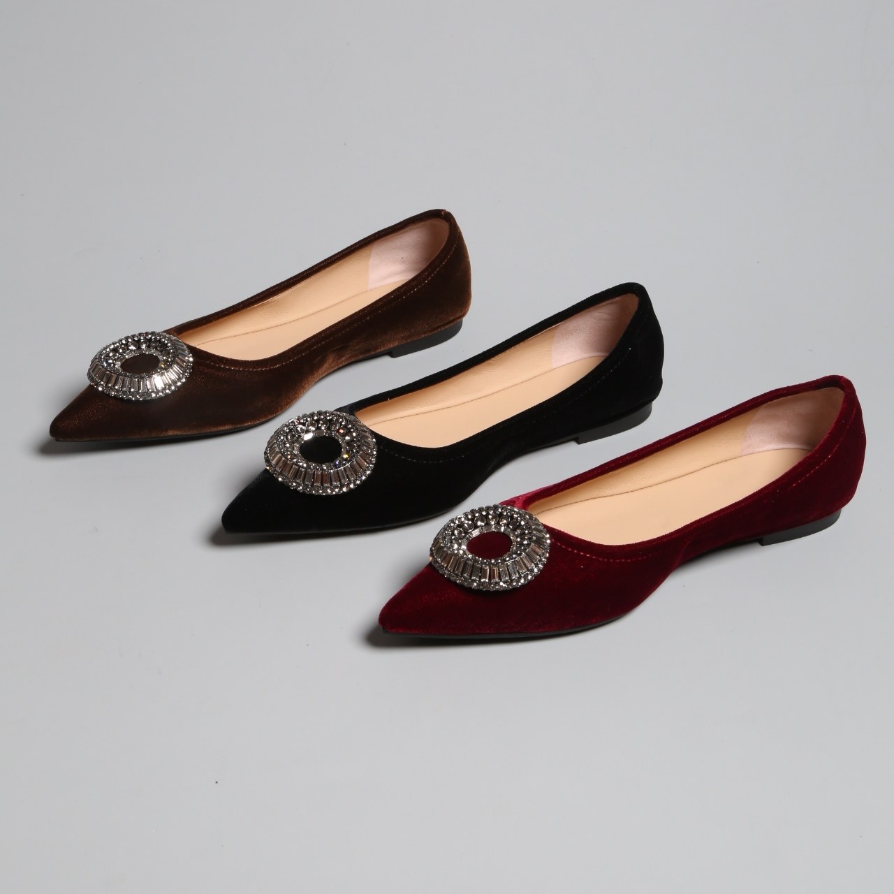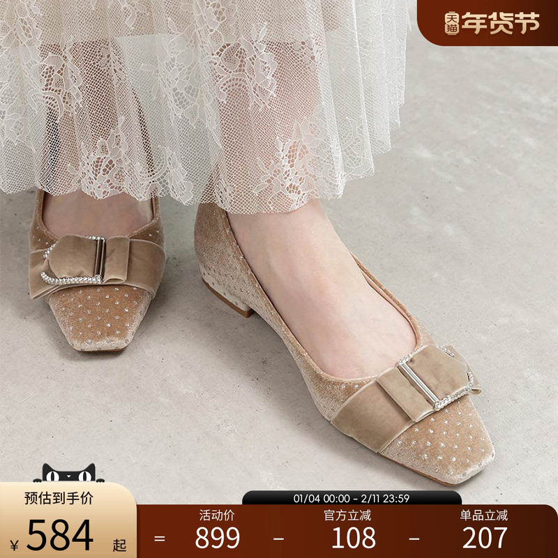 商场同款25年春秋新自由姿色天鹅绒奢华质感大珍珠水钻扣浅口单鞋