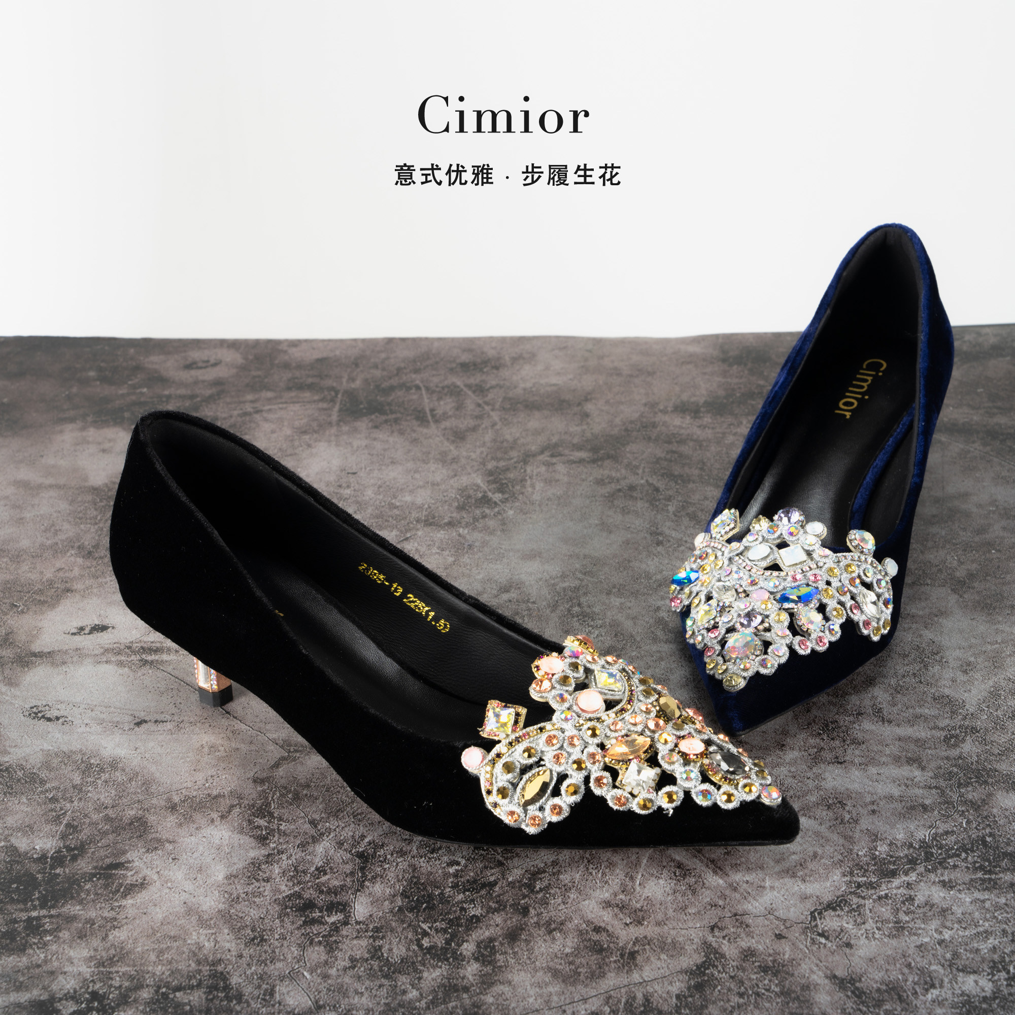 Cimior意大利手工女鞋25秋拜占庭天鹅绒钻跟单鞋吊牌3280 CL25066