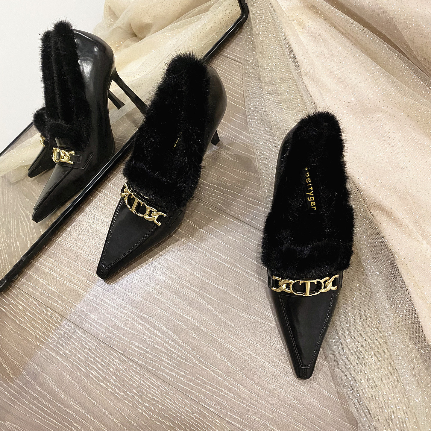 羊皮版dingyun丁允毛毛高跟鞋秋冬加绒单鞋尖头法式旗袍女鞋细跟