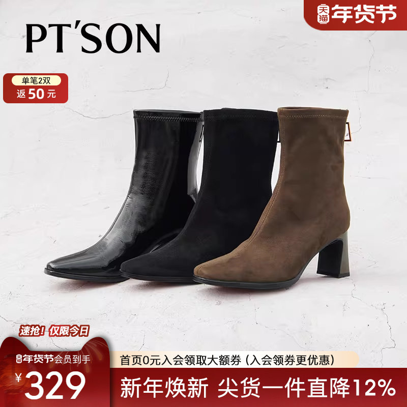星期六方头粗跟短靴女2025新款秋冬高跟鞋黑色瘦瘦靴小个子马丁靴