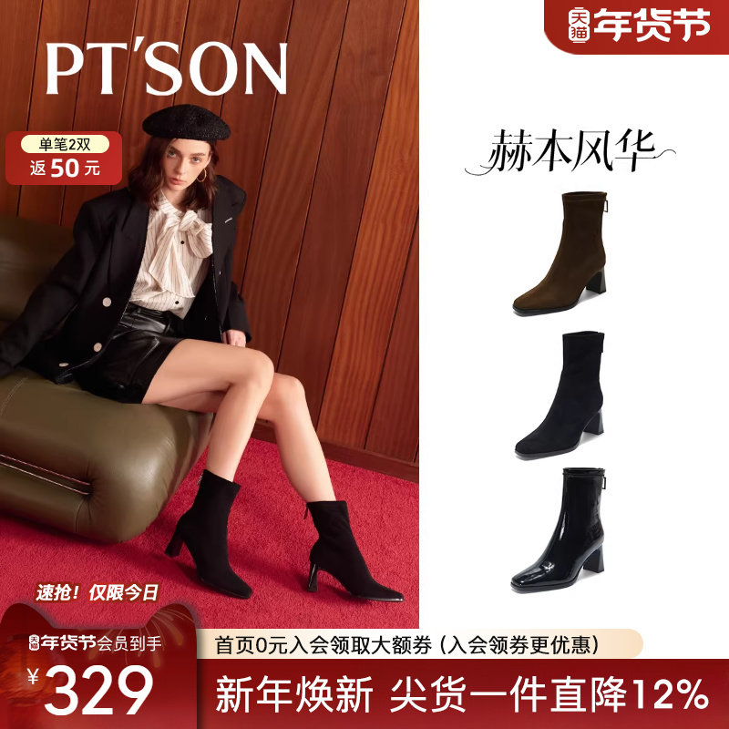 百田森羊皮法式小踝靴子女款尖头短靴女鞋秋冬高跟鞋配裙子的靴子
