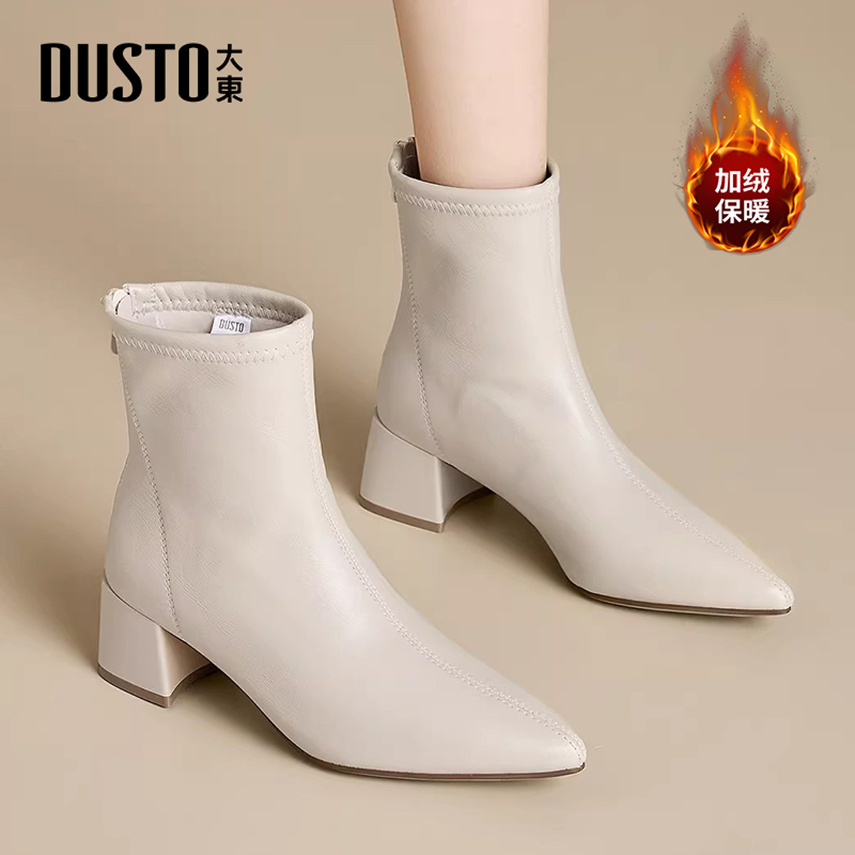 大东尖头白色短靴女2025新款秋冬高跟鞋配大衣的加绒靴子切尔西靴