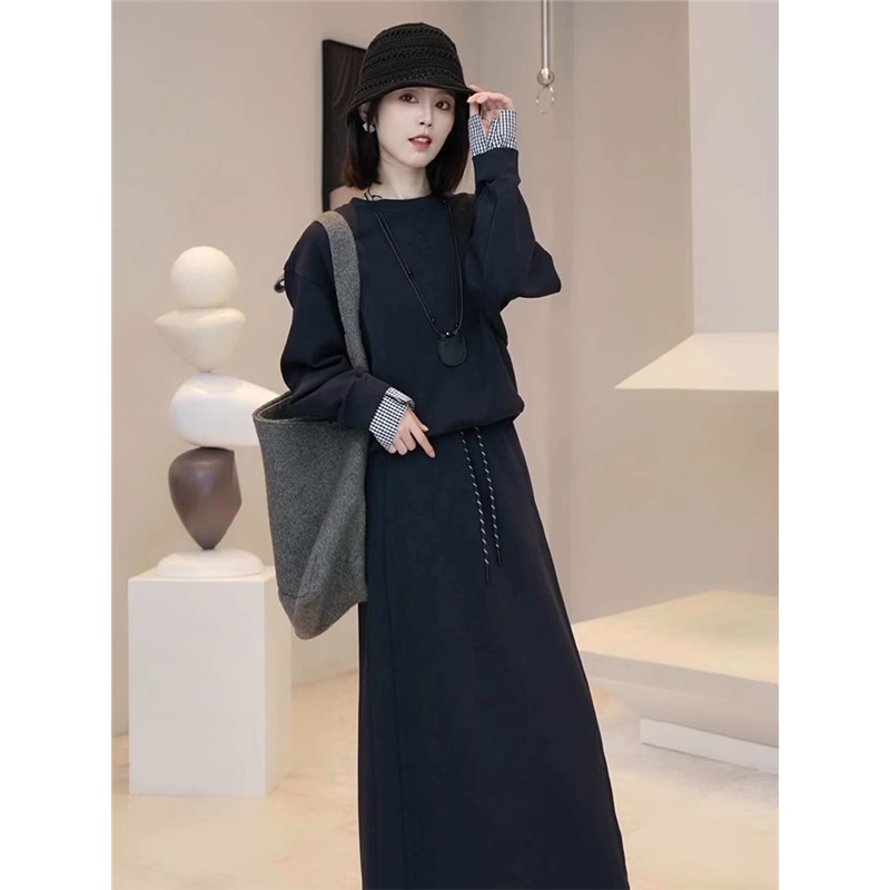 a02拼接设计感卫衣连衣裙女2025新款秋季黑色裙子设计感长裙秋装